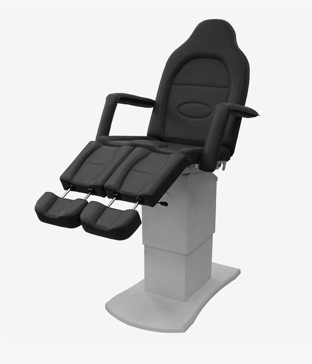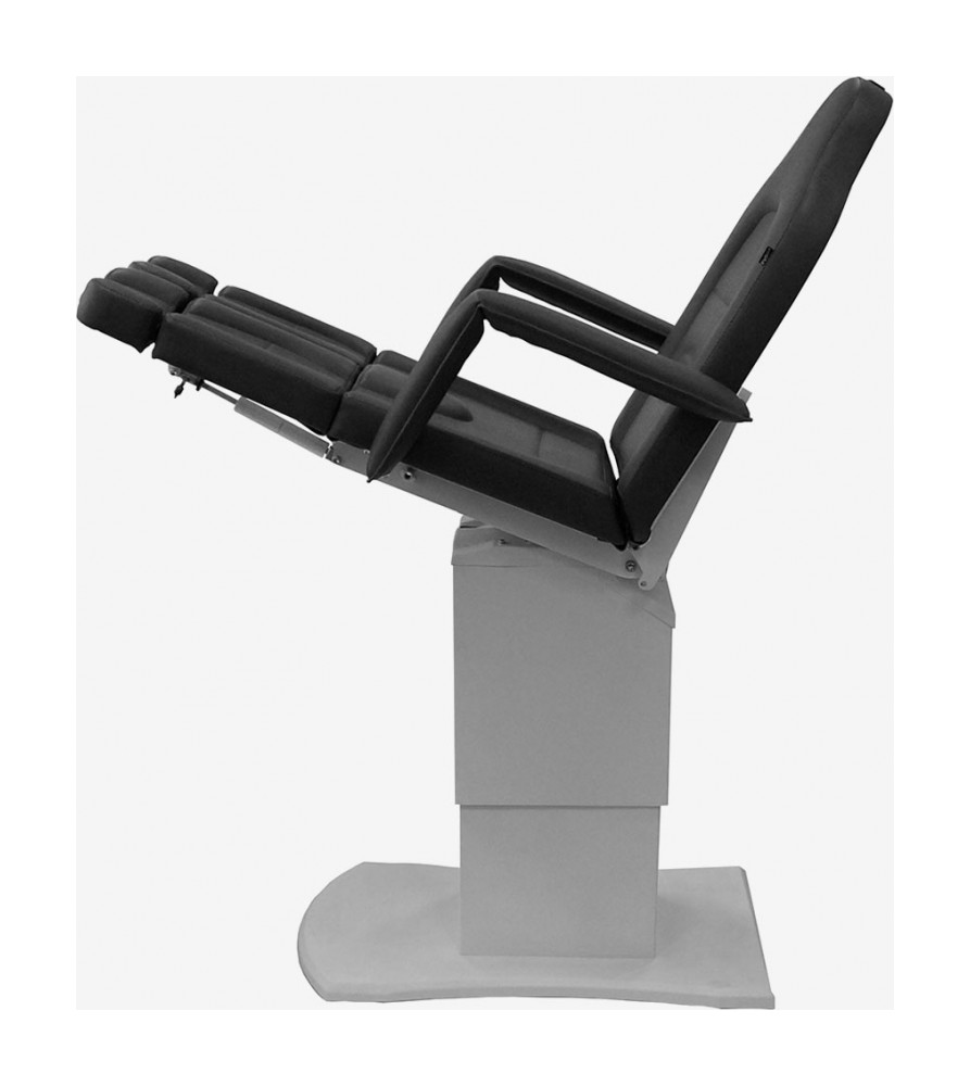 Педикюрное кресло оснащено тремя электромоторами, обеспечивающими регулировку высоты, угла наклона спинки и угла наклона сиденья. Опоры для ног фиксируются при помощи газ-лифтов. Кресло легко раскладывается в горизонтальное положение, образуя ровную поверхность. Надежная конструкция системы подъема обеспечивает высокую устойчивость кресла даже при максимальной высоте. Управляется при помощи ручного проводного пульта. Дополнительно при производстве могут быть установлены различные опции.